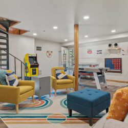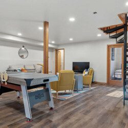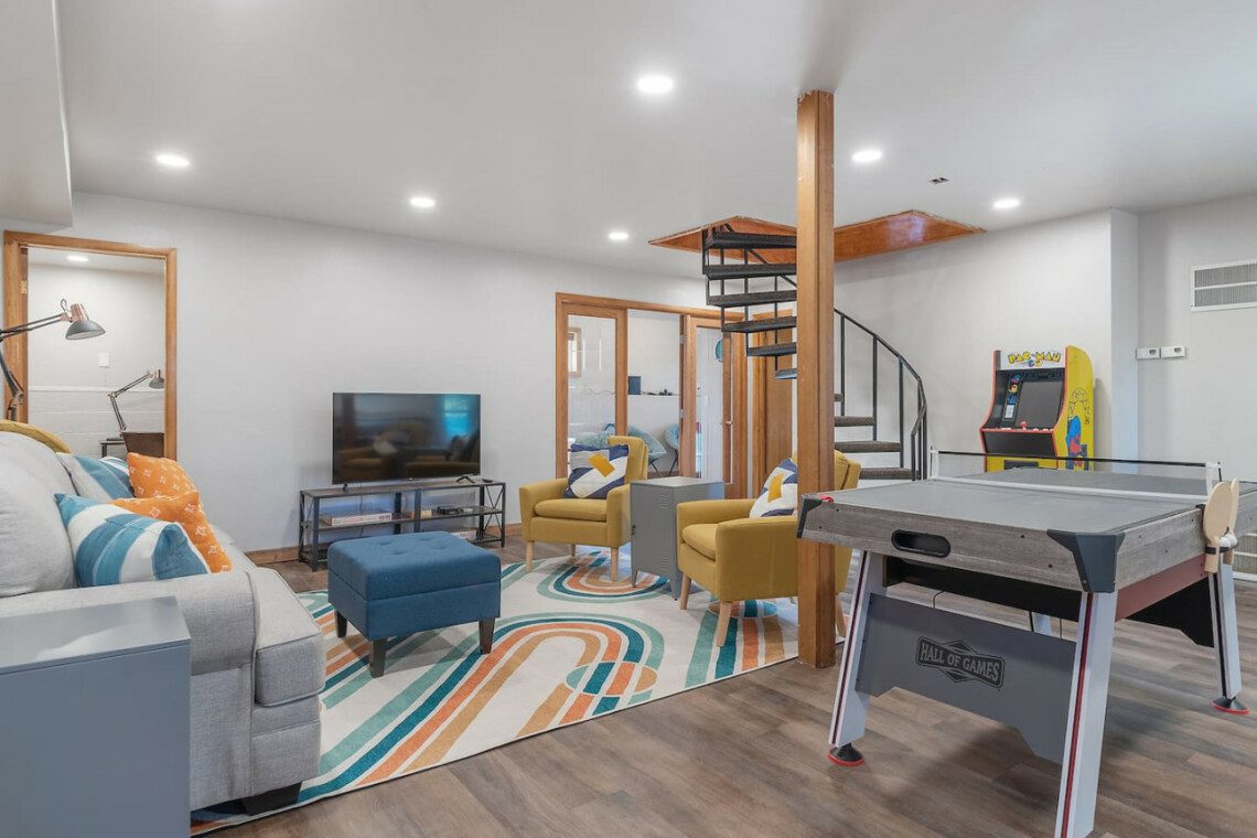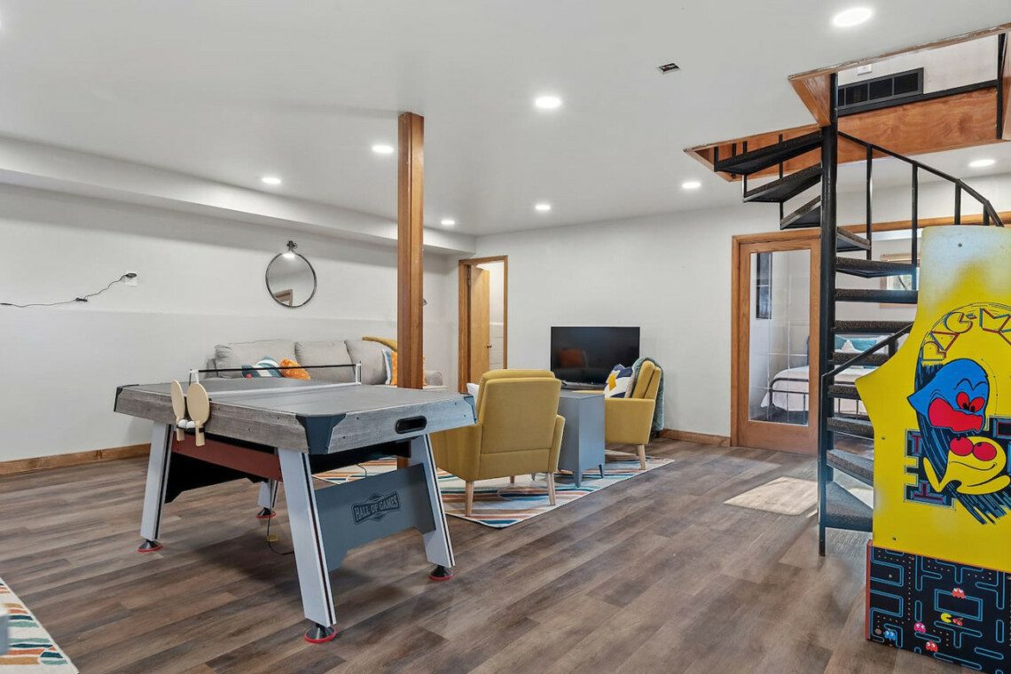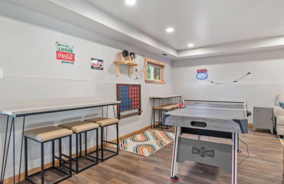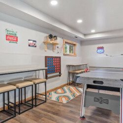 Inside, revel in Wi-Fi, TV, two living room areas, and a sleeper sofa on the main level. A private room is well-suited for work or relaxation. The 10-person dining table with slat-back side chairs is perfect for shared meals. The ground floor level hosts a game room with a variety of entertainment options, including tennis/air hockey, Connect Four Wall Game, Hockey Ring Toss, Arcade Game, a 4-piece counter table, and a selection of board games.