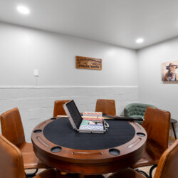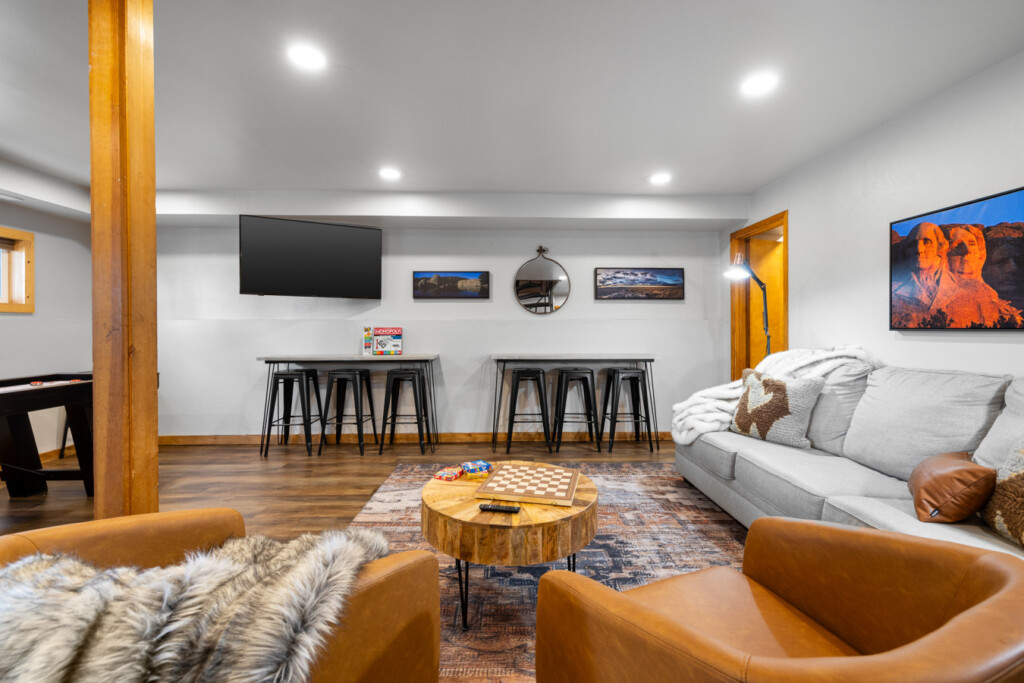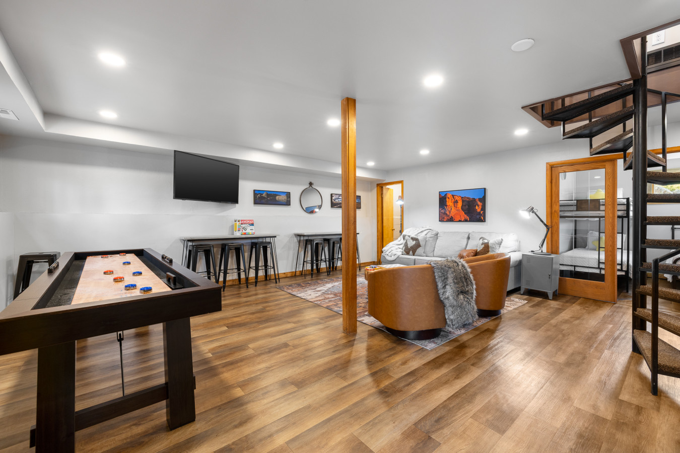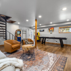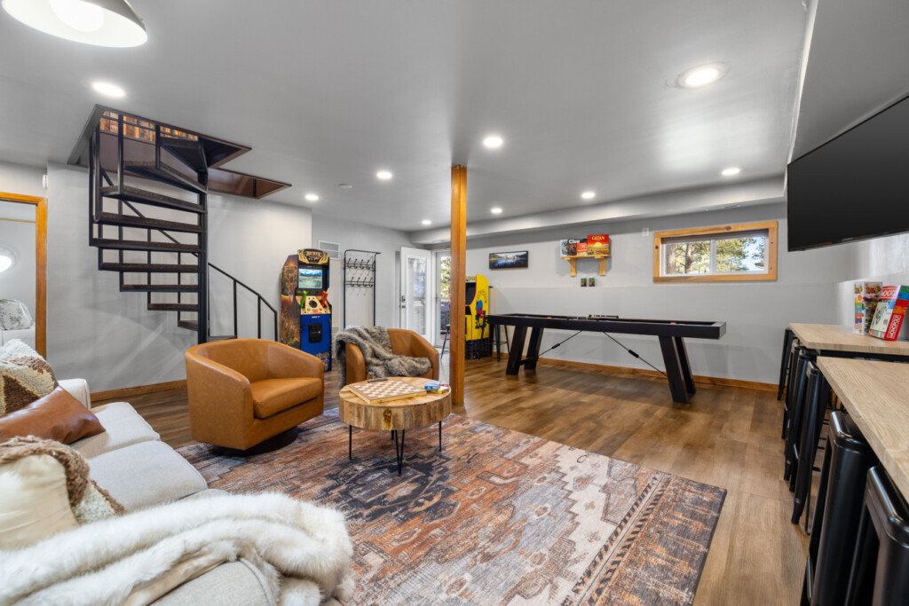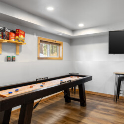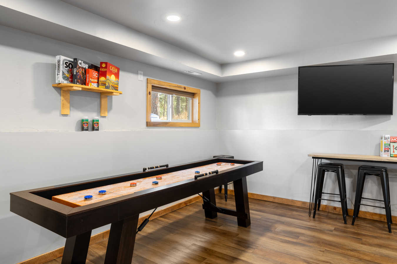 Inside, revel in Wi-Fi, TV, two living room areas, and a sleeper sofa on the main level. A private room is well-suited for work or relaxation. The 10-person dining table with slat-back side chairs is perfect for shared meals. The ground floor level hosts a game room with a variety of entertainment options, including tennis/air hockey, Connect Four Wall Game, Hockey Ring Toss, Arcade Game, a 4-piece counter table, and a selection of board games.