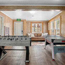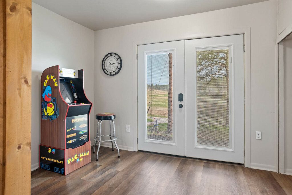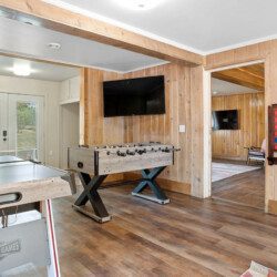Inside, enjoy the convenience of Wi-Fi, a living room TV, two kitchen counter bar stools, and a 6-person dining table. A dedicated game room awaits with additional entertainment options, including a TV, Foosball Table, Air Powered Hockey with Table Tennis Top, Connect Four Wall Mounted, and a Pac-Man/Arcade game. A diverse selection of board games adds to the indoor fun.
